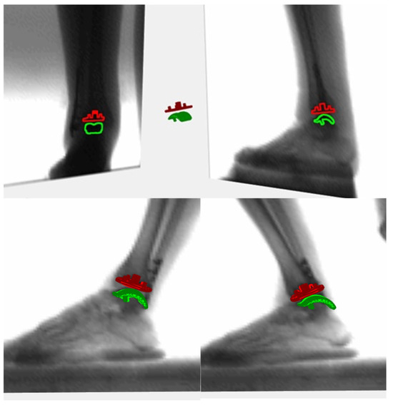 The MB-RSA assessment was performed through two radiographic tubes and two digital panels perpendicularly positioned that were synchronized to acquire two contemporary sets of images [12] (Figure 1). A single operator post-processed the images using MATLAB software (R2020b, MathWorks Inc., Natik, MA, USA). At this stage, the contours’ segmentation and CAD model positioning of the tibial and talus components were performed [20].