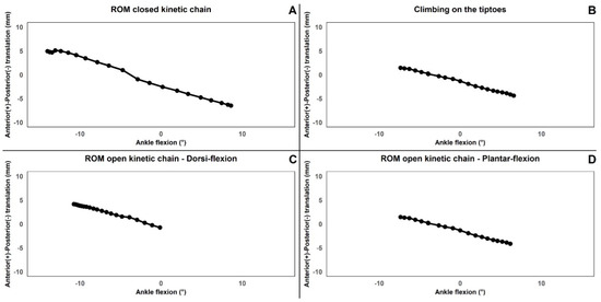 (A) Total range of motion with closed kinetic chain; (B) climbing on tiptoes; (C) total range of motion with open kinetic chain—dorsiflexion phase; (D) total range of motion with open kinetic chain. The antero-posterior translation in mm (Y Axis) represents the angular distance of rotation and not the anteroposterior migration of the polyethylene.
