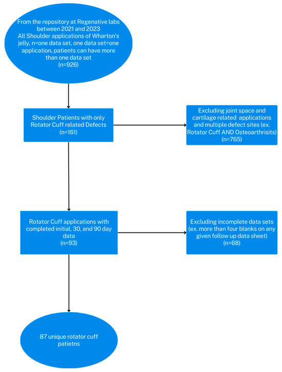 This study cohort is derived from the observational retrospective repository at Regenative Labs. The data repository is in accordance with the Declaration of Helsinki and has maintained approval from the Institutional Review Board of the Institute of Regenerative and Cellular Medicine (IRCM-2022-311) since May 2021. The repository protocol includes observational data collection of patients who provide informed consent and receive one or more applications of either their Wharton’s Jelly tissue allografts ProTextTM, CryoTextTM, SecreTextTM, or their dehydrated amniotic membrane allograft, AmnioTextTM. All patients in the repository have documented failure of standard of care practices for at least 90 days regardless of use site, making them candidates for Wharton’s jelly tissue allografts. All methods of tissue processing at Regenative Labs, Pensacola, FL, USA, comply with the FDA and American Association of Tissue Banks (AATB) standards. Greater details of tissue allograft production can be found on the manufacturer’s website. The study design for this paper identified the unique patients from the repository who had one application to either the tendons or muscles of the rotator cuff (infraspinatus, supraspinatus, subscapularis, teres minor). The inclusion and exclusion criteria can be found in the study flowchart below (Figure 1).