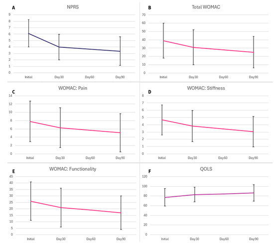 Patients filled out a questionnaire on the day of application, consisting of the numerical pain rating scale (NPRS), the Western Ontario and McMaster Universities arthritis index (WOMAC), and quality of life scales (QOLS). As this sample is from a large retrospective repository that initially focused on lower extremities, the WOMAC is not ideal for evaluating shoulder-related issues. However, it is still relevant because the patient reports their pain evaluation based on the defect relevant to their WJ application. Patients answered the same questionnaire 30 and 90 days after the initial allograft application. The scores of these two scales were analyzed individually to allow for a more significant examination of the physical mobility of the affected joint.