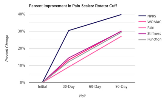 Although all patients who received an application had failed the standard of care for eight weeks minimum, one limitation of this study is the lack of a control group to compare improvements to due to the nature of the retrospective repository used. Looking at the current literature, we can compare similar patient groups with other conservative treatments and placebo groups. A study by Annaniemi in 2022 compares platelet-rich plasma (PRP) and corticosteroid (CS) injections for rotator cuff tendinopathy. The patients either received three PRP injections or one CS and were tracked at intervals of 6, 12, and 18 months [22]. There was a total of 75 patients aged 18–90. Both groups showed improvement in the Western Ontario Rotator Cuff Index (WORC), Visual Analog Scale (VAS), and Range of Motion (ROM), but there was no significant difference between the groups. Their study did not have a 3-month follow-up point, but the median improvement percentage between the initial visit and their 6-month follow for the PRP group and CS group was approximately 27% and 32%, respectively, for WORC, and 30% and 34%, respectively, for VAS. A systematic review and meta-analysis by Bansal in 2023 compared hyaluronic acid (HA) injections to PRP, CS, and placebo groups from 18 randomized control trials (RCTs) [9]. They found that there was significant improvement (p < 0.05) in VAS and constant Murphy score when comparing HA with physical therapy and PRP on short-term follow-up (1 and 3 months), with insignificant results on comparing HA with placebo (normal saline) and steroids. When comparing to our results from one application of WJ, the NPRS that is comparable to VAS may have improved better than other noninvasive modalities while the WOMAC, comparable to the WORC, had similar results. Although pain is relative, one study found that long-term radiographic assessment after rotator cuff repair reveals direct correlations between failure and patient-reported outcomes, functional deterioration, progression of arthritis, and/or frank cuff tear arthropathy [23]. As previously mentioned, the WOMAC is not the ideal scale for rotator cuff defects, so further studies with the commonly used WORC can be performed to better understand the efficacy of WJ compared to other modalities like PRP, CS, HA, and placebo groups.