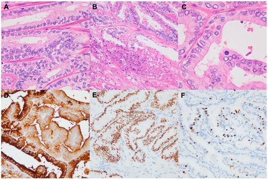 Squamous cell carcinoma (SCC) without a well-differentiated thyroid carcinoma component has been considered a unique histologic type. The WHO 5th edition has incorporated SCC into ATC because SCC of the thyroid generally shows BRAF p.V600E mutations (87%) and is immunohistologically positive for the follicular cell markers PAX8 (91%) and TTF1 (38%) [,,]. SCC of the thyroid also exhibits a poor prognosis comparable to that of other ATCs. The squamous metaplasia of follicular cells and the squamous differentiation of PTC should not be mistaken for ATC. The direct invasion of primary SCC of the head and neck region should also be excluded.