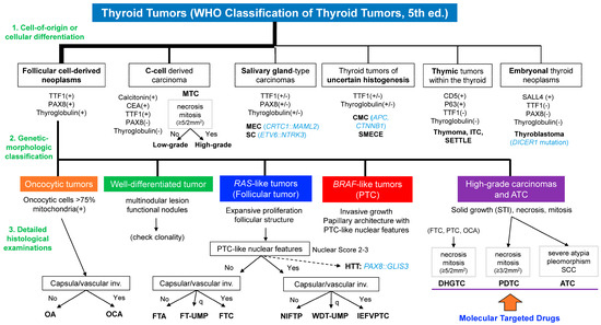 Thyroid cancer diagnoses, particularly in women, are on the rise. Improved detection methods have likely contributed to this trend, although environmental factors are also under investigation. Despite the increase in diagnoses, mortality rates remain low. Thyroid tumors are classified by listing the major histologic types: follicular thyroid adenoma (FTA), a benign tumor; papillary thyroid carcinoma (PTC); follicular thyroid carcinoma (FTC); anaplastic thyroid carcinoma (ATC); and medullary thyroid carcinoma (MTC) [,]. The results of large-scale genome analyses, including TCGA (The Cancer Genome Atlas), have accumulated. The fourth edition of the WHO Classification of Endocrine Tumors (WHO 4th), published in 2017, included information on the driver genes associated with thyroid cancer []. WHO released a beta version of the new classification of endocrine and neuroendocrine tumors (WHO 5th) in 2022 [,]. Continuing the trend of the WHO 4th and taking tumor-specific molecular genetic information into account, the WHO 5th has been fundamentally revised. It now includes a systematic classification based on the cell of origin and the clinical risk (Table 1). The main categories are follicular cell-derived neoplasms (FDNs) and parafollicular cell (C cell)-derived tumors, with FDNs further divided into three classes: benign, low-risk, and malignant (Table 1). The only C cell-derived tumor is the malignant MTC, which encompasses low-grade and high-grade subcategories. Other tumors are also re-classified as salivary-gland-type carcinomas of the thyroid, thyroid tumors of uncertain histogenesis, thymic tumors within the thyroid, and embryonal thyroid neoplasms. This paper outlines critical points that enable us to better understand the WHO 5th.