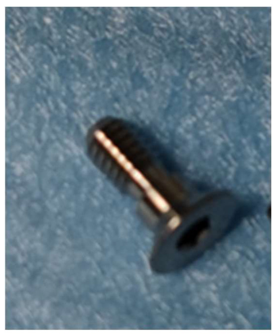 The gum adjacent to the extracted molar was incised mesiodistally using a scalpel blade, after which it was detached from the underlying bone [15] (Figure 4). Once the submucosal bone was exposed, a 1 mm deep cavity was created using the drill attached to the X-Cube implant motor (Saeshin America, Irvine, CA, USA). The diameter of the bone defect was 1 mm, into which a titanium implant 4 mm long and 1 mm in diameter was screwed by hand screwing in a clockwise direction using a screw end from the implantology kit until it was no longer possible to move. The implant placement procedure involved meticulous positioning to prevent perforation of the buccal bone as well as the wall of the nasal cavity. Mobilization of the mucosa was achieved using a minimally invasive approach, incorporating a split flap technique around the implants to facilitate initial submerged healing. The incision was sutured with nonabsorbable suture material (PremiCron 6/0, B. Braun Surgical, SA, Rubi, Spain). Following implantation, a four-week period was allocated for healing and osseous integration.