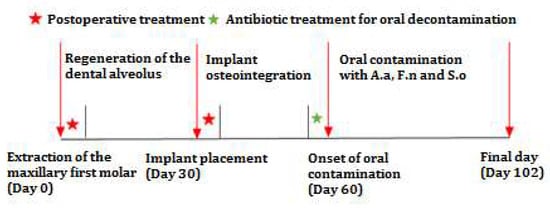 This study aimed to develop peri-implantitis in the rat model by oral contamination with bacteria responsible for PI in humans, and it was carried out in three stages: the extraction of the maxillary first molar to reproduce the human edentation, the mounting of the implant, and finally, the contamination of the device by gavage with A.a, F.n and S.o, concentration 109 CFU/mL, 5 days/week, 6 weeks. For this experiment, we used 20 male Wistar rats, weighing 350–400 g at the start of the study. Dental extraction required approaches and instrumentation similar to the human dental technique, and the period required to regenerate the dental alveolus was 30 days. This was followed by the implantation of the device on the edentulous site using specific equipment, and we also allowed 30 days for integration, which was a stage preceded by the exposure of the implant to the bacterial action and the follow-up of the clinical evolution [14].