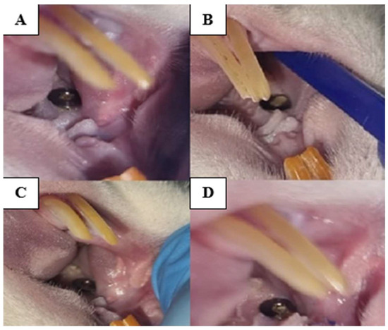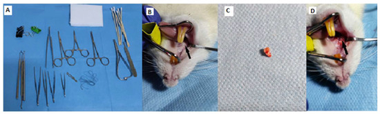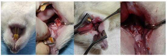 Under general anesthesia, ketamine (0.5 mg/kg, Farmavet, Bucharest, Romania) and medetomidine (0.5 mg/kg, Biotur, Alexandria, Romania) administered intramuscularly, the rats were placed on the operating table in a dorsal–ventral decubitus position [14]. A buccal spacer was inserted between the upper and lower incisors. Utilizing a dental instrument designed for human application, the gum adjacent to the left first molar in the jaw was gently separated from the tooth. Through rotational movements in the axis of the tooth, its mobility was created until it was extracted (Figure 3). As the maneuvering space was relatively narrow, during the extraction procedure in some animals, only the tooth crown was detached; in this case, the retinal roots within the alveolus were extracted using surgical forceps to ensure a clear extraction site. Subsequently, the gingiva was sutured in a single point with a 4/0 nonabsorbable suture.
