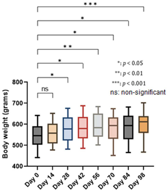 Evolution of body weight in the process of peri-implantitis development: an increase in body weight after extraction can be observed, starting from day 14, maintained in an upward trend until almost the day of implant installation (day 56), when p < 0.01. After the installation of the implant, a slight decrease in weight was recorded, which was recovered until the end of the study. Comparing the weight of the animals at the beginning with that obtained at the end of the experiment, it can be said that it was slightly influenced, especially after the surgical interventions, but p < 0.001 between day 0 and day 98 suggests the favorable evolution of animal welfare during the study.