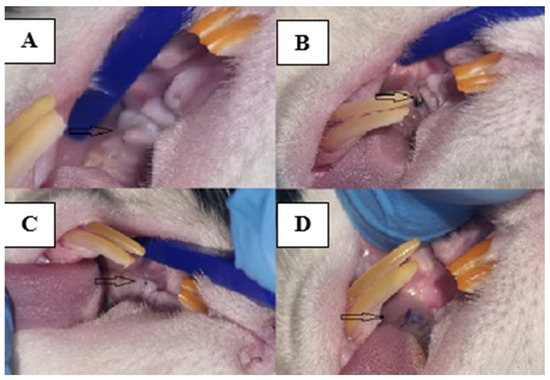 Clinical aspect of the implanted zone at the beginning of oral contamination (indicated by the arrow with black outline). The vast majority of animals (A,C,D) have healthy gums, where the suture line has been preserved. In only one case (B), the implant appeared exposed, with the gingival margin, with a normal appearance, molded on the implant.