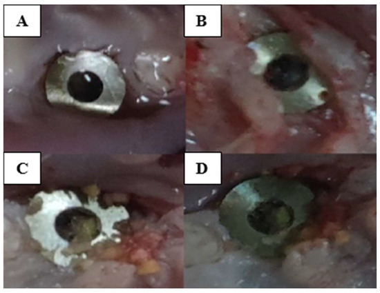 Clinical aspect of the implanted area at the end of the experiment. Uncovered implants, covered with plaque and food debris (A–D), frayed gingival margin (A,B,D), bleeding around the implants (A,C,D).