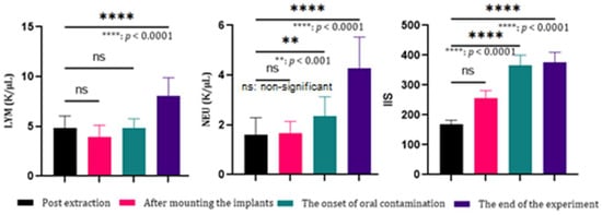 The relationship between PI and changes in hematological parameters has yet to be investigated in experimental studies. Therefore, we evaluated the dynamics of the complete blood count after extraction of the maxillary first molar, after implant placement, at the onset of oral infection, and at the end of the study. Interest was focused on the analysis of the parameters of the white line where lymphocytes, neutrophils, and the systemic immunoinflammatory index had p < 0.0001, a value with strong statistical relevance, especially after the onset of oral contamination (Figure 9).