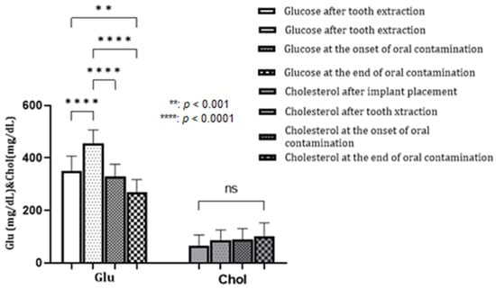 Biochemical values were divided into three variables: kidney function, liver function, and metabolic function (blood glucose and cholesterol level). The kidney subset included values for BUN and CREA concentration, the liver function subset analyzed ALP, ALT, and the last subset was for blood glucose and cholesterol levels. Regarding the glucose values, we observed a significant increase in the concentration with statistically significant relevance after the implant installation (p < 0.0001) maintained until the middle of the period of oral contamination, after which a decrease followed, so that on the final day, p < 0.001, compared to day 0, as seen in Figure 10. Cholesterol values, although showing increasing levels throughout the experiment, did not reach statistical significance, so we do not consider PI to have any influence on this parameter.