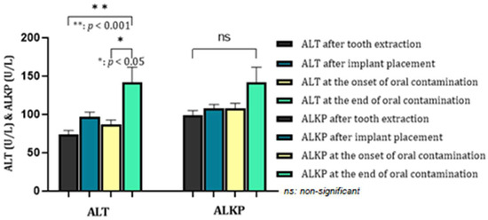 If in periodontal disease, ALKP shows changes in bone metabolism, in PI, it did not show significant oscillations. However, especially at the end of the experiment, the enzyme values were noticeably higher (Figure 11). ALT, at the end of the study, had a higher level (p < 0.001) than the experiment’s beginning.