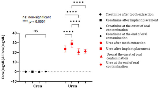 The renal profile expressed upward changes related to the level of blood urea with a solid statistical relevance, observed after the installation of the implant (p < 0.0001), followed by essential decreases throughout contamination of the oral cavity (Figure 12).