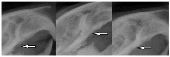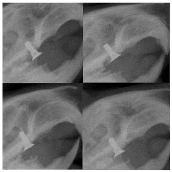 Radiological examination was performed post-extraction, one month after implant placement, and at the end of the study. Establishing the diagnosis of PI, the stage and the evolutionary phase are ensured by the corroboration of clinically expressed signs and imaging techniques (intraoral or panoramic radiographs) to determine the degree of bone loss. Even though micro-computed tomography is a modern analysis method, classic radiography is still a valid and reliable tool for detecting peri-implant disease. At the beginning and end of the experiment, in order to appreciate the impact of the bacterial action on the bone support, we evaluated the animals radiographically by exposure to the In Vivo Imaging IVIS Lumina XRMS device (Werner ROEDL—PerkinElmer, Traiskirchen, Austria), which allows obtaining sensitive multispectral images in just 10 s. For such an analysis, it is necessary to anesthetize the animals so that the images and their quality are superior.