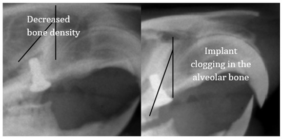 In peri-implant disease, radiographic images can assess the height of the alveolar bone in relation to the implant structure. In the case of our experiment, after the completion of the six weeks of bacterial contamination, it was possible to observe the displacement of the implants from the position parallel to the roots of the collateral teeth and a reduction in the bone density at the edge of the alveolar ridge (Figure 15).