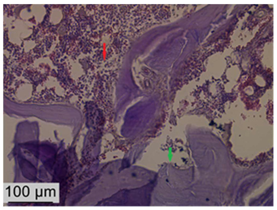 Histological features at the alveolar bone level: inflammatory infiltrate rich in lymphocytes and neutrophils, osteoblasts (red arrow), and disorganized bone matrix (green arrow). Hematoxylin–eosin staining, ob 20×.