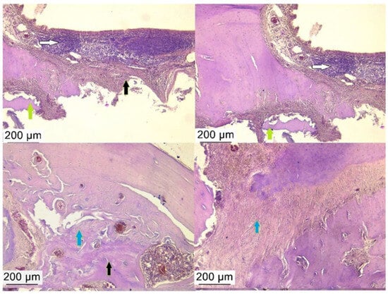 Pronounced inflammatory reaction at the gingival margin (white arrow) accompanied by reorganization of connective tissue and bone support (black arrow) alongside a rich infiltrate of collagen fibers and fibrous tissue (blue arrow). The green arrow shows the detachment of bone fragments, which is delimited by a marked inflammatory reaction. Hematoxylin–eosin staining, ob. 10×.