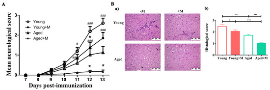 Memantine treatment reduced the mean neurological score and histological score in rats of both age groups. (Panel (A)) Line graph indicates the mean daily neurological score of EAE in rats treated with memantine (+M) or administered with vehicle (−M) for 7 consecutive days from day 7 to day 13 post-immunization. Data are presented as mean ± SEM (data from 4 experiments, n = 6 rats/group/experiment), with statistical differences determined using a two-way ANOVA; # p < 0.05; ## p < 0.01; ### p < 0.001; # young vs. aged; * p < 0.05; * +M vs. age-matched −M. (Panel (B)) Representative photomicrographs (a) indicate mononuclear cell infiltrations in spinal cord sections of memantine-treated (+M) or administered with vehicle (−M) young and aged rats. The arrows indicate mononuclear cell infiltrates. Bar graph (b) indicates histological scores for spinal cord of memantine-treated and untreated young and aged EAE rats. Histological scoring is described in the Material and Methods section. Data are presented as mean ± SEM (n = 3 rats/group). * p < 0.05; *** p < 0.001.