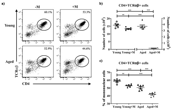 Memantine reduced the frequency and number of CD4+ T lymphocytes infiltrating the spinal cord of immunized rats of both age groups. (a) Representative flow cytometry dot plots present CD4 vs. TCRαβ staining of mononuclear cells (MNCs) retrieved at the peak of EAE from spinal cords (SCs) of young and aged rats treated with memantine (+M) or vehicle (−M). Numbers in dot plots represent frequency. Scatter plots present (b) the number of CD4+ TCRαβ+ cells and (c) their frequency among MNC cells retrieved from SCs. Data are presented as mean ± SEM from 6 rats per group, with statistical differences determined using a two-way ANOVA. ** p < 0.01; *** p < 0.001.