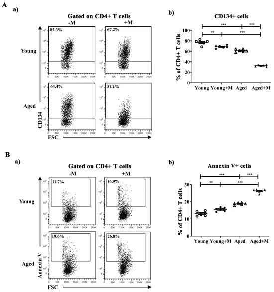 Memantine reduced reactivation and increased apoptosis of CD4+ T lymphocytes in the SC more effectively in aged than in young EAE rats. Representative flow cytometry dot plots show (a) CD134 (Panel (A)) and (a) Annexin V (Panel (B)) staining of cells gated as CD4+ T lymphocytes among mononuclear cells (MNCs) retrieved at the peak of EAE from spinal cords (SCs) of young and aged rats treated with memantine (+M) or vehicle (−M). Numbers in dot plots represent frequency. Scatter plots present the frequency of (b) CD134+ (Panel (A)) and (b) Annexin V+ (Panel (B)) cells among CD4+ T cells in SCs from young and aged +M and −M EAE rats. Data are presented as mean ± SEM from 6 rats per group. Two-way ANOVA showed significant interaction between the effects of treatment and age for the frequency of CD134+ cells (F(1,20) = 63.22; p < 0.001) and Annexin V+ cells (F(1,20) = 34.34; p < 0.001). ** p < 0.01; *** p < 0.001.