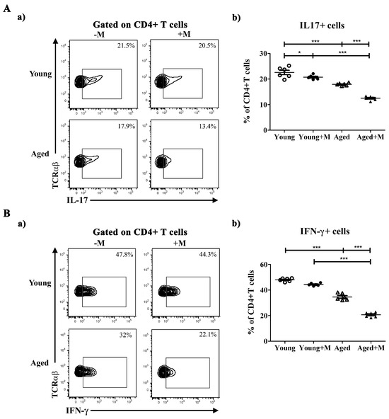 The CD4+ T lymphocytes were examined for their IL-17 and IFN-γ production. The proportion of IL-17+ cells among CD4+ T lymphocytes was lower (p < 0.01) in young rats treated with memantine then in age-matched untreated counterparts, while there was no difference in the proportion of IFN-γ+ cells among these cells (Figure 4). On the other hand, the proportion of both IL-17+ and IFN-γ+ cells was significantly lower (p < 0.001) in aged rats administered with memantine than in age-matched untreated counterparts (Figure 4).