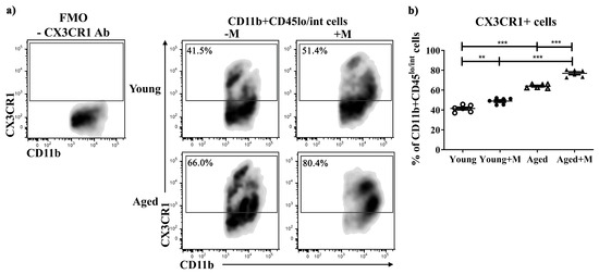 The fractalkine receptor (CX3CR1) is present exclusively on microglial cells in the CNS [34,35]. Disruption of CXCL1/CX3CR1 signaling is considered to be one of the most important elements in the pathogenesis of CNS-related disorders [36,37]. Pro-inflammatory microglia activation results in a loss of CX3CR1 [38]. Furthermore, the phagocytic capacity of microglia is significantly reduced in CX3CR1 gene knockout mice, resulting in the persistence of myelin debris and impaired remyelination [39]. Based on the surface expression of the CD45 molecule, we distinguished pro-inflammatory monocytes that infiltrated the SC (CD11b+CD45high) and microglia (CD11b+CD45low/int). We found that memantine-induced increase in the frequency of CX3CR1+ cells among CD11b+CD45lo/int cells was less pronounced in SCs from young (p < 0.01) than aged (p < 0.001) EAE rats (Figure 5).