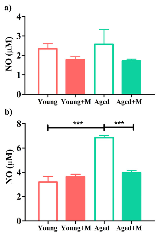 In the absence of LPS, there was no difference in NO production from SC mononuclear cells retrieved from untreated and treated rats of both age groups (Figure 6a). On the other hand, NO production was higher (p < 0.001) in LPS-stimulated SC mononuclear cells from aged than from young untreated rats. Moreover, NO production was significantly decreased (p < 0.001) by LPS-stimulated mononuclear cells harvested from SCs of memantine-treated aged rats, whereas this effect was absent in LPS-stimulated mononuclear SC cells from young memantine-treated rats (Figure 6b).