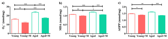 There are numerous findings that point to a significant role of oxidative stress in the pathogenesis of MS and its animal model EAE [41,42]. On the other hand, reactive oxygen species (ROS) play an important role in the aging process. During the aging process, increased ROS production is accompanied by a reduction in antioxidant defense [43,44,45]. Here, the level of superoxide anion radicals (O2˙−) was higher (p < 0.001) in the brain tissue of aged rats than in the brain tissue of young rats. However, the NMDAR antagonist reduced O2˙− levels to a greater extent in aged rats (p < 0.001) than in young rats (p < 0.01) (Figure 7). In addition, brain tissue from EAE rats was analyzed for the levels of MDA, a marker of lipid peroxidation, and AOPP, a reliable marker of the degree of oxidant-induced protein damage. Higher levels of MDA and AOPP were found in the brain tissue of aged rats compared with their levels in brain tissue of young EAE rats (p < 0.001; p < 0.01; respectively). Memantine treatment led to a reduction in MDA and AOPP levels in the brain tissue of treated EAE rats of both ages, but again to a greater extent in aged (p < 0.001) than in young rats (p < 0.01; p < 0.05; respectively) (Figure 7).