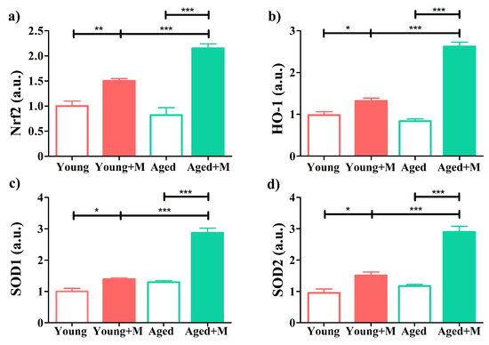 Nrf2 is considered to be the major transcription factor that regulates antioxidant response element-mediated gene expression in order to regulate the physiologic and pathophysiologic outcomes of oxidant exposure [46,47]. Considering that (i) low Nrf2 levels in the CNS are the most likely cause of the inability to elicit a strong antioxidant response in EAE [48]; (ii) memantine promotes the expression of the NRF2/HO-1 antioxidant signaling pathway [49]; and (iii) memantine upregulates SOD1 and SOD2, antioxidant genes regulated by Nrf2 transcription factor [47,50], in brain tissue of EAE rats [24], the expression of Nrf2, HO-1, SOD1, and SOD2 mRNAs in brain tissue was examined. There was no significant difference in the expression of mRNA for Nrf2 in the brain tissue of untreated young compared with aged EAE rats (Figure 8). Memantine increased the expression of mRNA for Nrf2 in EAE rats of both age groups, but this was more pronounced in aged (p < 0.001) than in young rats (p < 0.01) (Figure 8). In agreement with this finding, the expression of HO-1, SOD1, and SOD2 mRNAs was increased in the brain tissue of young (p < 0.05) and aged (p < 0.001) EAE rats after memantine administration, although this was more pronounced in aged EAE rats (Figure 8).