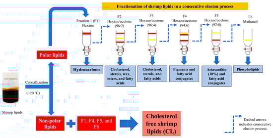 Different fractions of shrimp lipids were separated through the silica gel column using different solvents at several ratios [22]. Oil was first extracted from a shrimp cephalothorax [38]. Then, polar lipids were separated from the shrimp oil via ethanol crystallization at −20 °C. Thereafter, the obtained polar lipids (350 mg) were dissolved in the minimum volume of hexane, allowing them to settle at the top of the celite layer and then pass through the silica gel using hexane (100 mL), in which the first fraction (F1) was collected. To acquire the second, third, fourth, and fifth fractions, namely F2, F3, F4, and F5, respectively, the hexane/acetone mixture at varying ratios of 98:2, 96:4, 94:6, and 92:8 (v/v), respectively, was passed through the column. During loading, solvents were poured slowly around the wall of the column without disturbing the gel. Elution was accomplished when the reddish orange color in the eluent disappeared. The final fraction (F6) was eluted using methanol. The elution was performed at a constant flow rate of 4.5 mL/min. All the fractions were collected, and the elution volume for each fraction was recorded. Subsequently, evaporation was carried out using a rotary evaporator (Tokyo Rikakikai, Tokyo, Japan). The CLs were obtained by mixing non-polar lipids and fractions F1, F4, F5, and F6 (Figure 1). The mixed lipids were flushed with nitrogen, stored in an amber bottle, and tightly capped before being placed at −40 °C.
