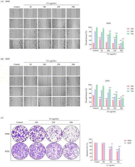 In order to evaluate the effect of CLs on migratory behavior, a wound-healing assay was conducted. Briefly, a confluent monolayer of NSCLC cancer cells was scratched to create a “wound”, and then the cells were treated with non-toxic concentrations of CLs (0–500 μg/mL) for 24, 48, and 72 h. In the case of H460 cells, cell migration was inhibited by CLs at the highest dose for 24 h (Figure 3A). However, CLs at concentrations of 50–500 μg/mL significantly decreased the migration of the H292 cells after 24 h (Figure 3B). Furthermore, the larger wound space detected in H460 and H292 cells incubated with 100–500 μg/mL CLs suggested an inhibitory effect on cell motility, while 50 g/mL CLs had no significant effect on cell migration for 48 and 72 h (Figure 3A,B). The results suggest that CLs have differential effects on cell migration depending on the cell type and concentration used.