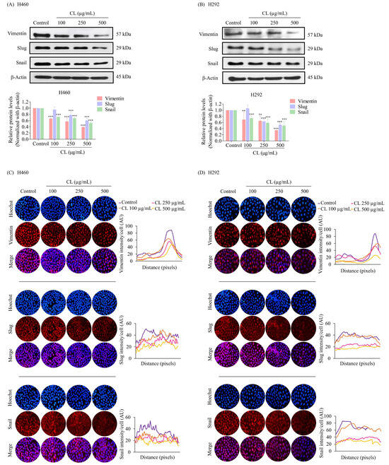 EMT has been shown to facilitate the dissemination of cancer cells from the primary tumor, invade tissues, and spread to form secondary tumors [5]. To determine whether CLs affected tumor cell migration by blocking EMT, we detected the expression of the key EMT regulatory proteins in NSCLC cells. The cells were treated with CLs at concentrations ranging from 0 to 500 µg/mL for 48 h, and Western blotting was used to detect the protein expression levels of Snail, Slug, and Vimentin. The results showed that in both H460 and H292 cells, CL treatment significantly deregulated the expression of EMT transcription factors Snail and Slug compared to the control group (p < 0.05) (Figure 4A,B). Additionally, the expression of Vimentin, a mesenchymal marker, was also significantly decreased in both cell lines. These findings suggest that CLs may inhibit lung cancer cell migration by blocking EMT.