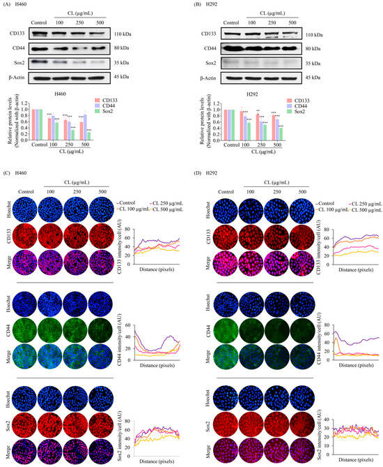 During EMT, cancer cells can acquire stem cell-like properties, including the ability to self-renew and differentiate, making them more invasive and resistant to therapy [8]. Cell surface markers, CD133 and CD44, are commonly used to identify CSCs. Cells expressing CD133 and CD44 markers have been shown to possess several characteristics that promote tumor growth and progression, including enhanced spheroid-forming ability and chemoresistance [9,10]. After 48 h of culture in CLs (0–500 g/mL), we employed Western blotting to evaluate CD133 and CD44 expression in H460 and H292 cells. The results indicated that in both H460 and H292 cells, CLs caused a dose-dependent reduction in the expression levels of both markers (Figure 5A,B). Moreover, CL treatment significantly decreased the expression level of the stem cell transcription factor Sox2 compared to the untreated control in both H460 and H292 cells (Figure 5A,B).
