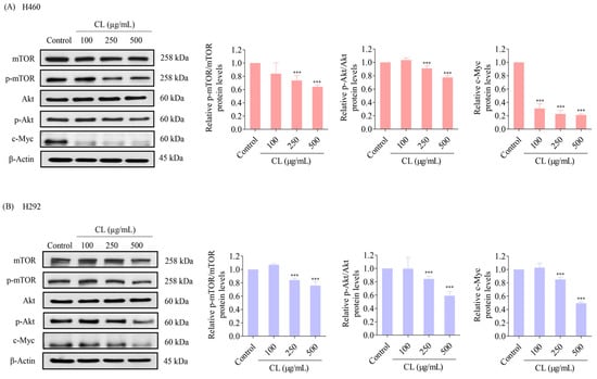 The upstream regulatory signals of the EMT and CSC phenotypes in NSCLC cells, such as Akt, mTOR, and c-Myc, were further analyzed. H460 and H292 cells were treated with various non-toxic concentrations of CLs (0–500 μg/mL) for 48 h. The protein levels of CSC upstream pathways including Akt, p-Akt, mTOR, and p-mTOR, and cell proliferation protein c-Myc were determined. The results showed that CLs at 100 µg/mL had no effect on p-mTOR/mTOR and p-Akt/Akt protein expression levels in both H460 and H292 cells (Figure 6A,B). However, a significant downregulation of p-mTOR/mTOR and p-Akt/Akt protein expression levels was observed at 250 and 500 µg/mL of CL treatment in the NSCLC cells (H460 and H292) compared with the untreated control (Figure 6A,B). Interestingly, the levels of expression of c-Myc were dramatically reduced after treatment with CLs in both cell lines (Figure 6A,B). These findings suggest that CLs may suppress the EMT and cancer stem cells in NSCLC cells by inhibiting Akt/mTOR signaling pathways and downregulating c-Myc expression.