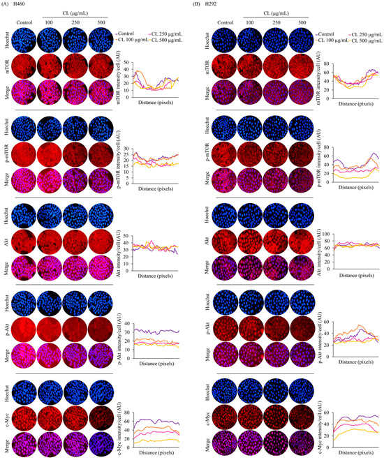 The inhibitory effect of cholesterol-free shrimp lipids (CLs) on the Akt/mTOR/c-Myc pathway in H460 and H292 non-small cell lung cancer (NSCLC) cells. (A) H460 and (B) H292 cells were treated with various concentrations of CLs (0–500 µg/mL) for 48 h. Fluorescence imaging was conducted to visualize the cellular distributions of mTOR, p-mTOR, Akt, p-Akt, and c-Myc. The red signal represents the staining of corresponding proteins, while the blue signal indicates nuclear DNA staining using Hoechst 33342. The graph illustrates the quantitative analysis of fluorescence intensity for mTOR, p-mTOR, Akt, p-Akt, and c-Myc in H460 and H292 cells. The data were captured using a fluorescence microscope and analyzed with Image J software version 1.52a. Data are represented as the means ± SD (n = 3).