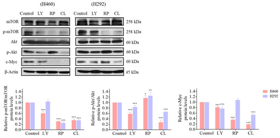 The regulatory effect of cholesterol-free shrimp lipids (CLs) on c-Myc expression via the inhibition of p-Akt and mTOR in H460 and H292 cells. The cells were seeded and treated with LY294002 (5 µM), rapamycin (2 µM), and CL (500 µg/mL) for 48 h. The expressions of mTOR, p-mTOR, Akt, p-Akt, and c-Myc were assessed by Western blotting. β-actin was utilized as a loading control to ensure equal loading of the protein samples. Densitometry analysis was performed for each protein, and the results are presented as relative protein levels compared to untreated control cells. Uncropped blots can be found in Supplemental Figure S4. Data are represented as the means ± SD (n = 3). * p < 0.05, ** p < 0.01, and *** p < 0.001 compared with untreated cells.