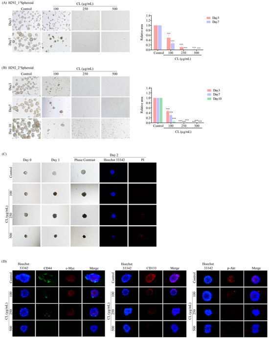 After 10 days, the secondary spheroids H460 and H292, which had comparable dimensions and shapes, were chosen. These spheroids were then treated with CLs at varying dosages (ranging from 0 to 500 g/mL), and their responses were monitored on days 0, 1, and 2. Individual CSC spheroids were visible in both the control and CL-treated cells on days 0, 1, and 2 (Figure 9C and Figure 10C). At the highest dose, CL treatment of CSC spheres drastically decreased the CSC populations in both H460 and H292 cells and resulted in a significant reduction in the size of CSC spheres in both cell lines, as shown in Figure 9C and Figure 10C, respectively. Interestingly, we observed that the spheroids were stained with PI after CL treatment at 250 and 500 µg/mL in both H460 (Figure 9C) and H292 (Figure 10C), indicating that CL exposure induced the death of CSC spheres.