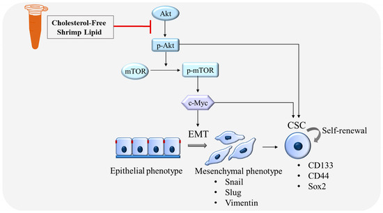 In conclusion, this study highlighted the potential health benefits of lipids derived from shrimp, particularly CLs, in suppressing key factors associated with cancer progression and metastasis. This investigation has, for the first time, revealed the potential of CLs to inhibit the migration of human lung cancer cells (H460 and H292) by targeting EMT. Furthermore, CLs exhibit promising effects on CSCs, as evidenced by the downregulation of stemness markers CD133, CD44, and Sox2 and the inhibition of CSC-induced spheroid formation. The underlying mechanism of action of CLs has been postulated to involve its capacity to inhibit Akt activation. Consequently, this leads to a reduction in the active phosphorylated Akt as well as its downstream targets, such as mTOR and c-Myc (as illustrated in Figure 11). The suppression of the Akt/mTOR/c-Myc pathway confers a pharmacological effect of CLs on impeding EMT and CSC, which are drivers of cancer metastasis. Nevertheless, the translation of these promising results into clinical applications requires further validation through comprehensive investigations and clinical trials. This study emphasizes the significance of exploring shrimp-derived lipids as a possible source of innovative anticancer compounds, providing new opportunities for advancements in cancer treatment.