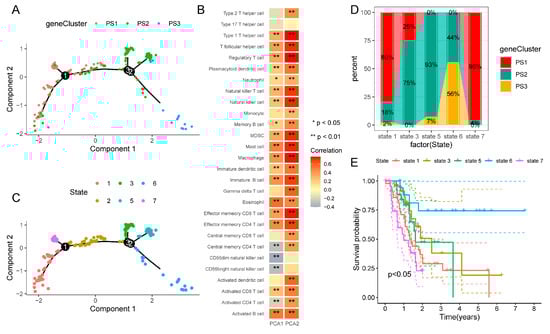 The pyroptosis landscape was constructed using the pyroptosis-related gene expression profiles of individual PAAD patients (Figure 8A). The x-axis (PCA1) was associated with various immune cells, of which the activated B cells, eosinophils, macrophages, mast cells, T follicular helper cells, etc. had the highest positive correlation, while the y-axis (PCA2) had a positive correlation with almost all immune cells (Figure 8B). Meanwhile, in a single subtype, we also observed some intra-cluster heterogeneity. All of the samples were further divided into six states (1, 2, 3, 5, 6, 7) according to the sample trajectory (Figure 8C). On the basis of their positions, we chose states that were located at the endpoints for further analysis, namely state 1, 3, 5, 6, and 7, and their proportions in the three pyroptosis subtypes were displayed in Figure 8D. Kaplan–Meier curves showed significant differences in OS between 5 states, of which state 6 had the best prognosis, whereas the survival curves of state 1, 3, 5, and 7 were relatively concentrated (Figure 8E). Subsequently, we compared the differences of 28 immune cells in these states and found that immune cell scores varied greatly between different states (Figure 8F). On the whole, the pyroptosis landscape based on pyroptosis subtypes did not have the ability to accurately identify the pyroptosis status and predict the prognosis of every PAAD patient. More samples may be needed for further confirmation and typing verification.