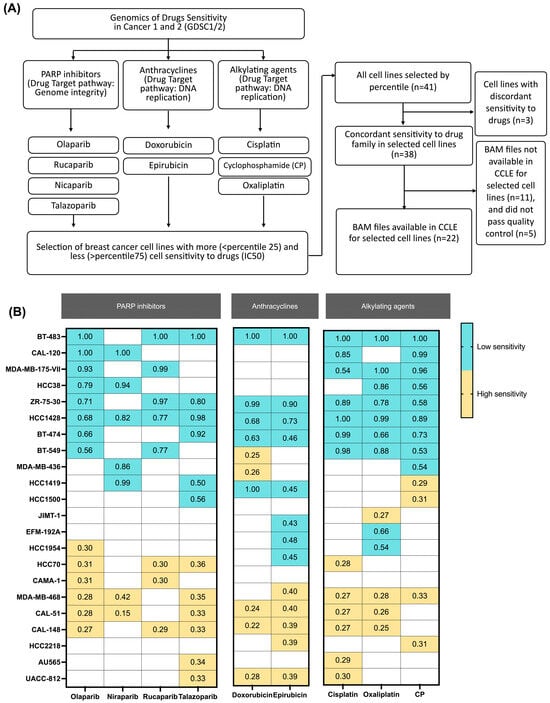 We considered all BC cell lines (n = 51) of the 8.4 release of Genomics of Drug Sensitivity in Cancer 1 (GDSC1) https://www.cancerrxgene.org/ (accessed in August 2022) (Figure 1A). Cell lines were specifically chosen from Genomics of Drugs Sensitivity in Cancer 2 (GDSC2) for PARP inhibitors (olaparib, niraparib, rucaparib, and talazoparib), anthracyclines (epirubicin and doxorubicin), and alkylating agents (cisplatin, oxaliplatin, and cyclophosphamide). The standardized half-maximal inhibitory concentration (IC50) was used to classify the BC lines into two groups based on drug sensitivity: those below the 25th percentile (quartile 1) were designated as high-sensitivity cell lines, while those above the 75th percentile (quartile 4) were classified as low-sensitivity cell lines for each drug (Figure 1B). Forty-one BC cell lines (of the total of 51 available) were present for all drugs studied. The BAM files from RNA-seq analyses for 22 BC cell lines were selected and downloaded from the National Cancer Institute GDC data portal https://portal.gdc.cancer.gov/ (downloaded in August 2022). Then, a quality check was conducted for all RNA-seq data using SAMtools stats (v1.6) and the MultiQC program (v1.12) [17,18].