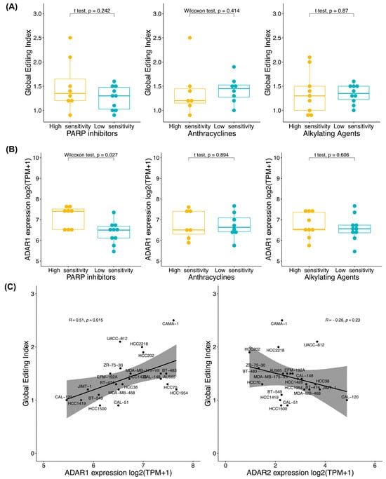 Global A>I(G) RNA-editing activity is partially positively correlated with ADAR1 expression by drug response in selected breast cancer cell lines. (A) Differences in global editing index in BC cell lines by drug sensitivity; (B) differences in ADAR1 expression log2 transcript per million (TPM+1) in BC cell lines by drug sensitivity; and (C) Pearson correlation between global editing index and ADAR1 (left) and ADAR2 (right) expression log2(TPM+1) in all BC cell lines by sensitivity (high and low) to PARP inhibitors, anthracyclines, and alkylating agents (n = 22). We analyzed 18 BC cell lines for PARP inhibitors (low (n = 10) and high sensitivity (n = 8)), 15 for anthracyclines (low (n = 8) and high sensitivity (n = 7)), and 19 for alkylating agents (low (n = 10) and high sensitivity (n = 9)).