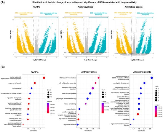 Biological processes enriched in DESs associated with low sensitivity. (A) Distribution of DESs according to the fold change of level edition (difference of the ratio of coefficients (α/α + β) from REDITs test) and false discovery rate (FDR), with overedited sites with high sensitivity (yellow) and overedited sites with low sensitivity (blue) to PARP inhibitors, anthracyclines, and alkylating agents; and (B) gene ontology analysis of DESs with PARP inhibitors (n = 6248), anthracyclines (n = 5479), and alkylating agents (n = 6473) in the biological process, assessing the proportion of genes associated with each biological function concerning the total number of genes analyzed.