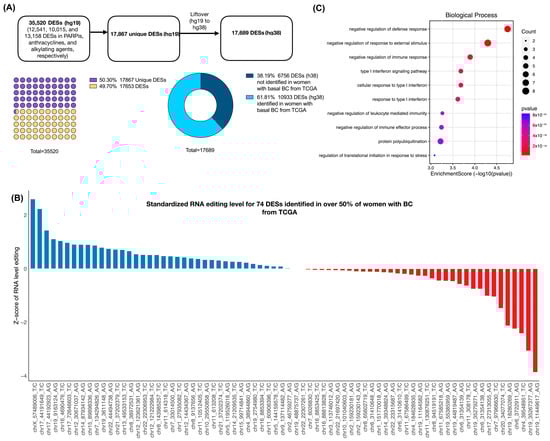 Our results were validated in a cohort of 86 women with basal BC from TCGA, grouped according to months of PFS. In these two groups, clinical characteristics are similar (Table S9). In LiftOver, 17,694 sites were converted and 173 failed (Figure 5A). Of 17,689, 10,933 (61.8%) were identified in this cohort, but only 74 DESs (0.67%) were in more than 50% of patients. For this, we show each site’s standardized RNA-edited level (Figure 5B), according to drug classification from cell lines (Figure S4). Additionally, the immune process is highlighted under the biological process from the gene ontology analysis of 66 genes of these DESs (Figure 5C).