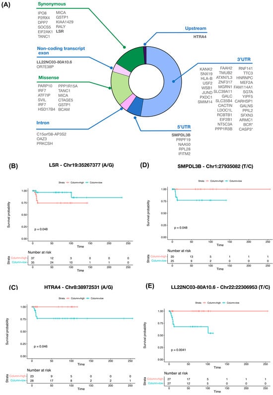 RNA-edited sites associated with drug sensitivity with clinical significance in patients with BC. (A) Genomic elements of 74 DESs; in bold are the editing sites associated with progression-free survival and asterisks (*) denote the cancer-related genes according to the CGC of COSMIC; (B) a significant relationship between progression-free survival in women with hyper-edited (n = 37) DESs was higher than in women with hypo-edited (n = 35) DESs in LSR (log-rank test p < 0.05); and (C) in women with hyper-edited (n = 23) DESs than in women with hypo-edited (n = 28) DESs in HTRA4 (log-rank test p < 0.05); (D) a significant relationship between progression-free survival in women with hyper-edited (n = 20) DESs than in women with hypo-edited (n = 25) DESs was found in SMPDL3B (log-rank test p < 0.05); and (E) a significant relationship between progression-free survival in women with hyper-edited (n = 27) DESs than in women with hypo-edited (n = 27) DESs was found in LL22NC03-80A10.6 (log-rank test p < 0.05).