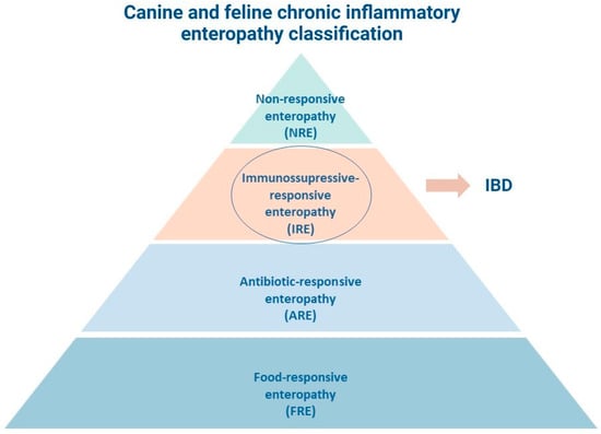 CIE in dogs and cats is classified into many entities based on their response to medical therapy. In contrast, IBD in both animals and human patients is a condition that may requires immunosuppressive medications, biologic drugs and, in some cases, surgery [].