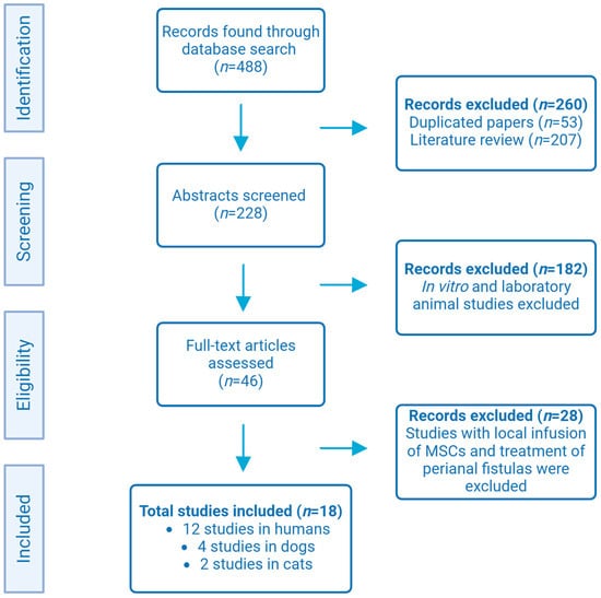 Flowchart of study selection. A total of 488 studies were analyzed. There were 18 studies that met the following criteria: clinical trials in humans, dogs, and cats with IBD treated with IV infusion of MSCs (Original figure created with BioRender.com).