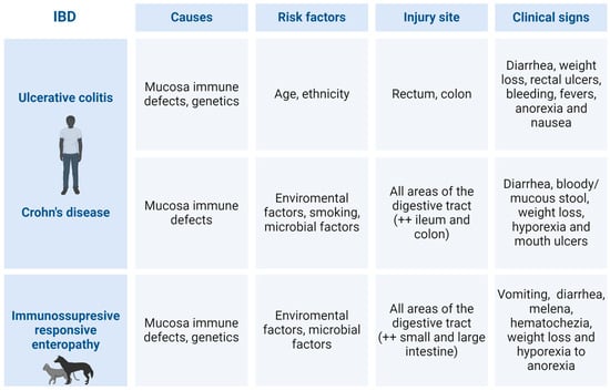 Differences in IBD causes, risk factors, injury sites and clinical signs between human and companion animals (dogs and cats). ++—with special incidence. (Original figure created with BioRender.com).