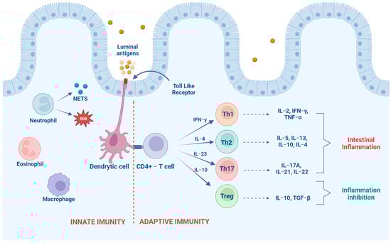The innate immune response culminates in the activation of dendritic cells, which function as a bridge between innate and adaptive immunity []. Lymphocytes are the principal effector cells in the adaptive immune response; they are activated in the gut to destroy harmful antigens [,]. Antigens are presented by dendritic cells to particular lymphocytes, such as naïve CD4+ T helper cells in secondary lymphoid organs (e.g., the mesenteric lymph node) [,]. Depending on the profile of cytokines releases, T helper cells can differentiate into Th1, Th2, and Th17 cells and regulatory T cells (Tregs), which produce multiple cytokines with different actions (Figure 4) [,]. After the antigens have been removed, lymphocytes are normally down-regulated to maintain intestinal homeostasis []. In IBD, there is a continuous stimulation of these lymphocytes, resulting in chronic inflammation [], and this disparity leads to the activation of macrophages and B cells, as well as the recruitment of circulating leukocytes into the gut []. Some authors could not demonstrate a clear Th1 or Th2 cytokine expression in dogs and cats with CIE [,,,], and there is no indication of a Th17 signature []. This finding in canine and feline CIE differs with human IBD, where patients with Crohn’s disease had relevant Th1/Th17 (cell-mediated) cytokine polarization, and in ulcerative colitis, a significant Th2 (humoral) cytokine profile [,].