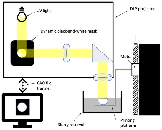 We opted for a top-down DLP printing technique and developed a printer accordingly. A DLP projector projects a black-and-white dynamic mask of ultraviolet light onto the slip surface to obtain a polymerisation corresponding to the slice of the object. The used slip combines photopolymerisable resins and a suspension of phosphocalcic powder, as described in Figure 1. The object being created rests on a motorised tray that is progressively immerged in the slip after each layer under the control of a stepper motor mounted on a high-precision linear guide. This controlled descent of the object allows for layers to be progressively added. A mechanical resolution of less than a micron could be obtained in the Z axis, and the DLP projector was able to provide dynamic masks with an XY-axis resolution of close to 40 µm. Our theorical maximal layer/Z resolution was 50 µm before sintering, as illustrated in Figure 2. The maximum printable dimensions are 95 × 50 × 150 mm.