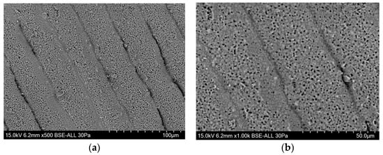 Scan of a printed part using an electron microscope with a resolution of 50 µm. We can see that at 500× (a) and 100× (b) magnifications, the layers are less than 50 µm thick due to sintering at 1050 °C, but the matrices maintain a high level of open porosity.
